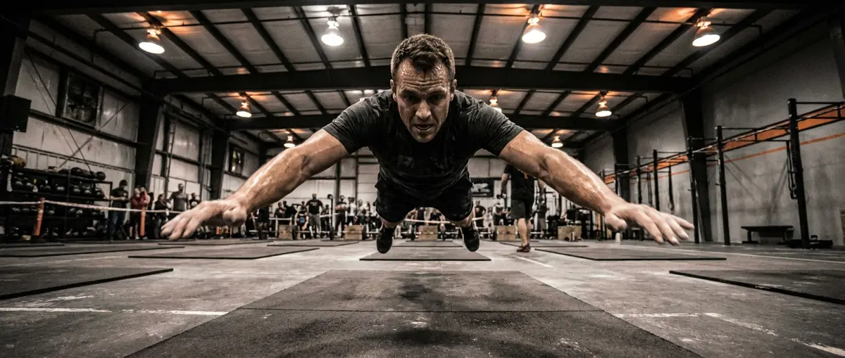 De burpee broad jumps zijn niet het zwaarste station qua absolute kracht of vermogen. De sled push is zwaarder. De wall balls duren langer. Maar geen enkel station vernietigt je mentaal zo hard als deze combinatie van horizontale sprong en full-body burpee.